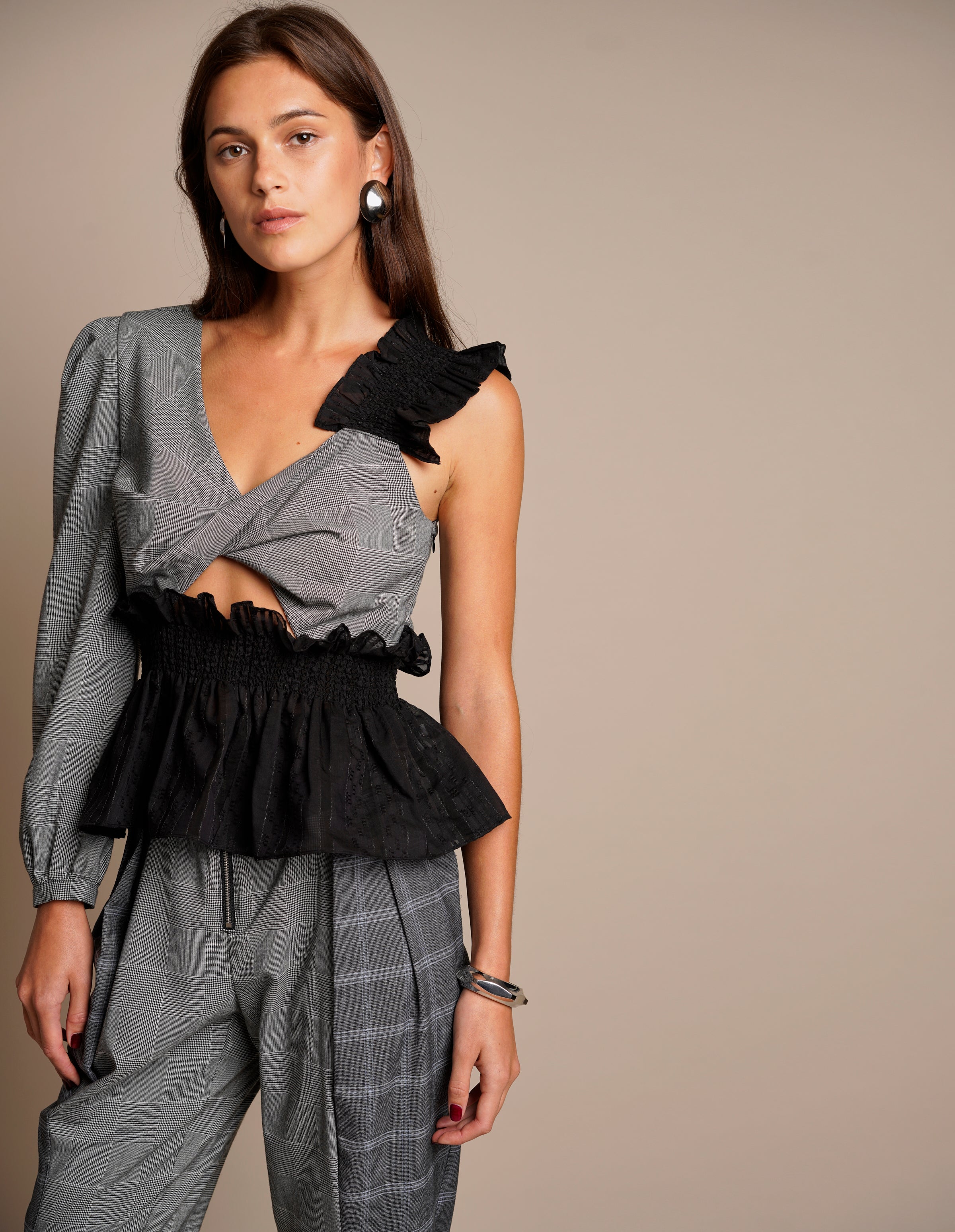 Girls just want to have fun. Nowhere is that truer than in fashion. This fall, treat yourself to some unapologetically feminine ruched and ruffled threads. Not only are they fun, they’re flattering; ruched fabric hides flaws while ruffles draw attention to your assets. Our Christian Crop Top reflects this trend with a silk, smocked peplum beneath a twisted bodice and peekaboo center. With one plaid long sleeve and one sleeveless side, this top’s dual personality is torn between working girl and party girl. (We know which one wins.)